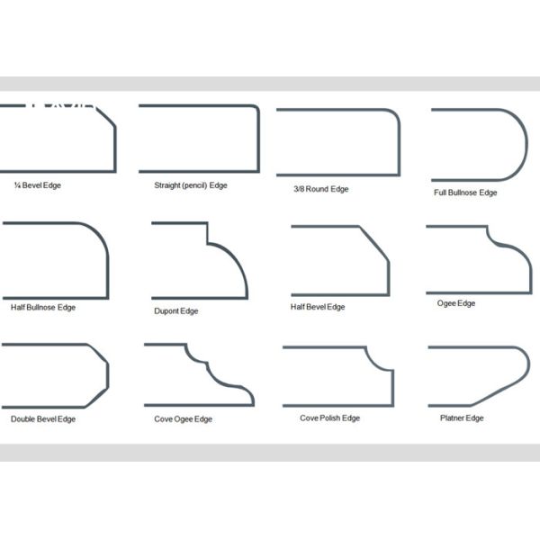 | flat polished, half bullnose, full bullnose, 1/4” bevel top, 3/8”bevel top, 3/8”radius top, dupont, ogee |